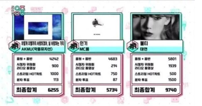值得一提的是,这次回归,泰妍并没有打歌,却得到了韩国三大台KBS、MBS、SBS的一位,可见泰妍的这次回归有多受欢迎,未打歌仍征服音乐节目,拿下3个一位!
