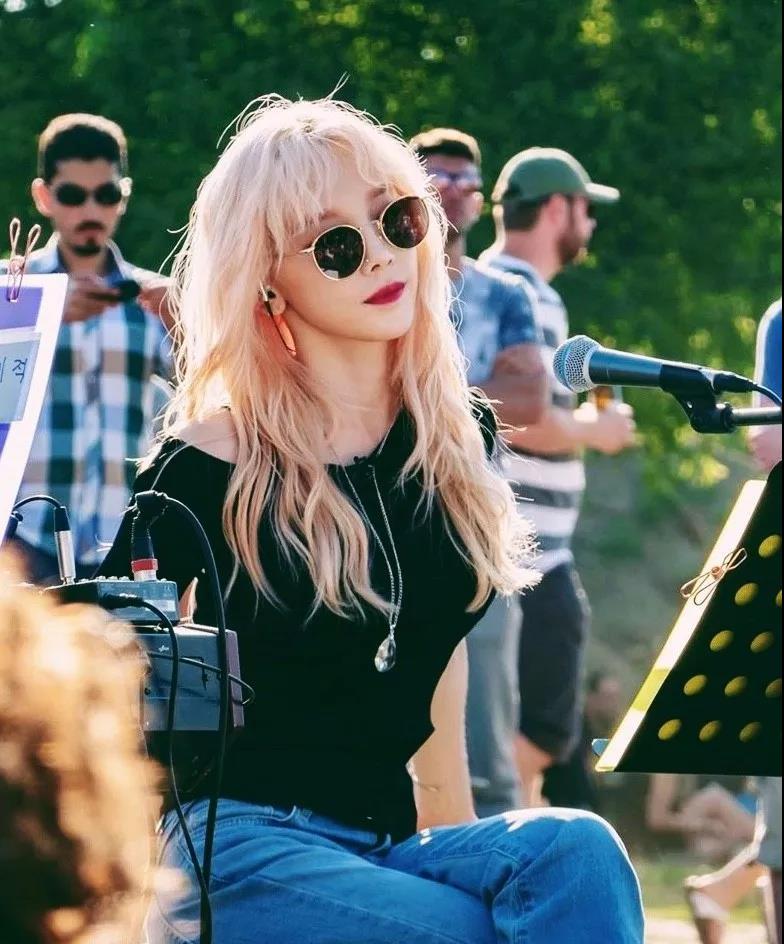 真的是换个发色像“换头”,这个粉金长发也是爱了,搭配黑色斜肩上衣加上圆框墨镜,活脱脱一个超飒的酷黑仙女!