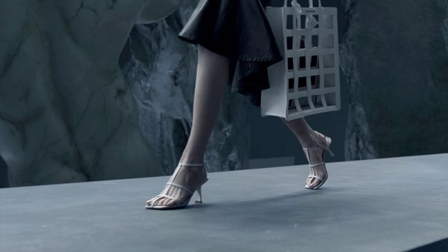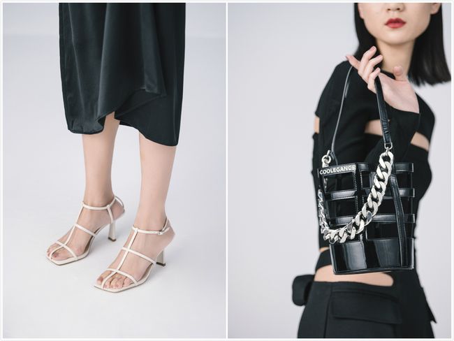 「挣扎STRUGGLE」系列:打造了现实物理世界中不可能存在的空间,在矛盾的背景下,表现人们思考变动和重构的过程。主要以黑色为主调,使用了缠绕、细条带元素,跟型上更用了新颖扇形跟、喇叭跟,以崭新的方式对鞋包进行了结构造型。