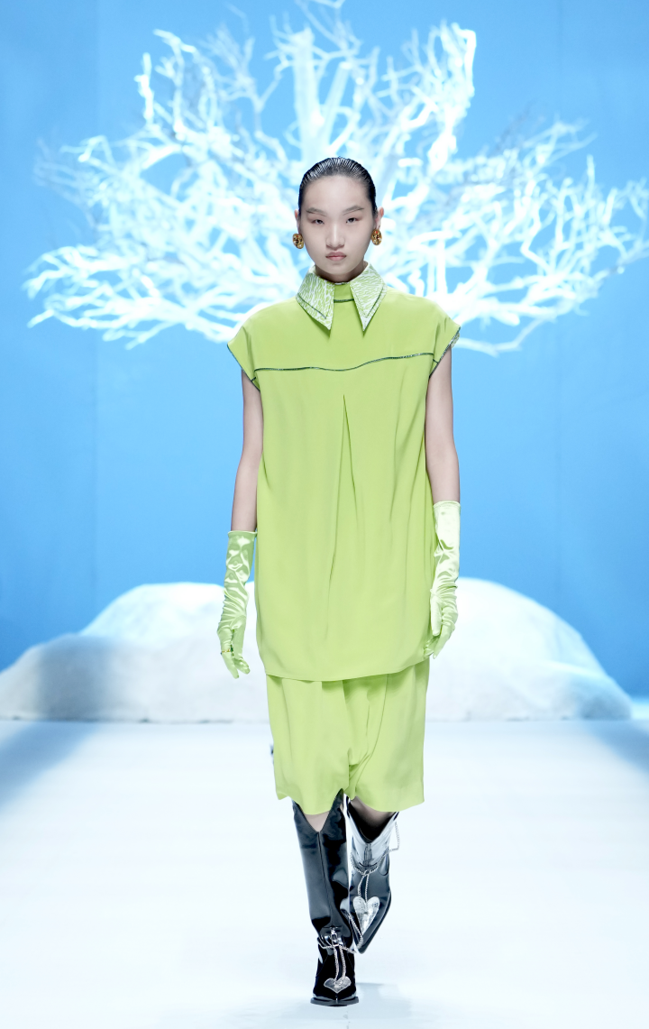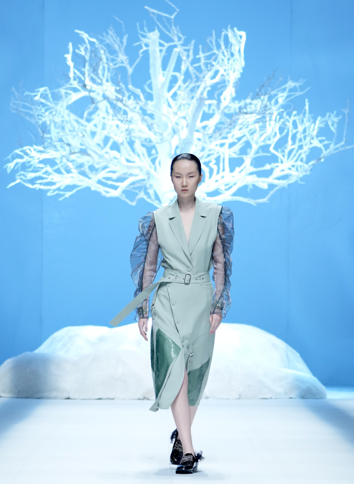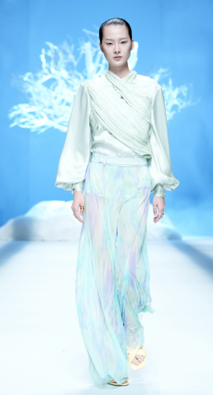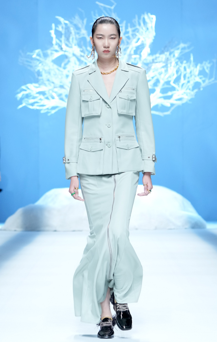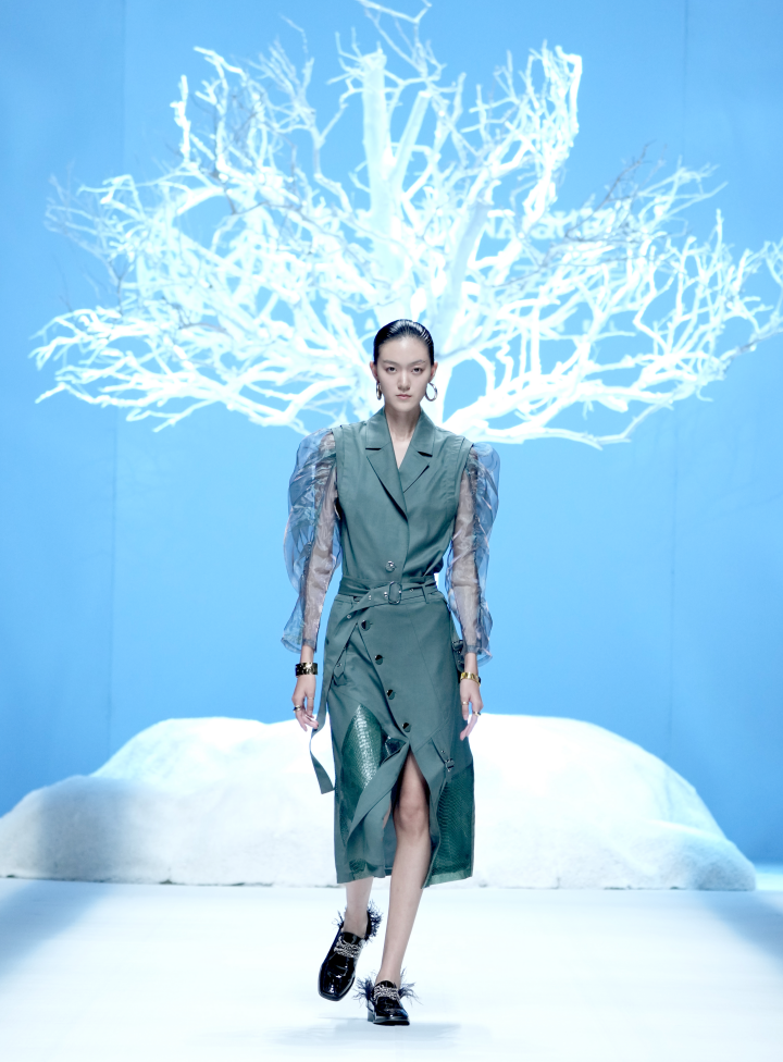 D.MARTINA QUEEN22SS面料设计的灵感图腾来源于《山海经》之《 海外西经》“轩辕之国,人面蛇身“。丁洁将蛇纹图腾进行时尚演练,将真丝与特种面料碰撞,大胆拼接颜色、拼接面料、拼接结构、结合D.MARTINA QUEEN所擅长的干练风格,利用立体剪裁手法融入肩部及服装廓形和一衣多穿等廓形塑造,以及品牌一直延续和升级的核心的设计风格:三大系列”中性职场襌衣系列“;”轻休闲尚衣下裳系列“;“轻礼服深衣系列”,再次把中国文化用“穿越时尚,对话未来”的手法升级职场女性中性飒爽的气场与多场合的身份转换,传递中国品牌未来时尚与精英女性的“尚衣下裳”新风尚。