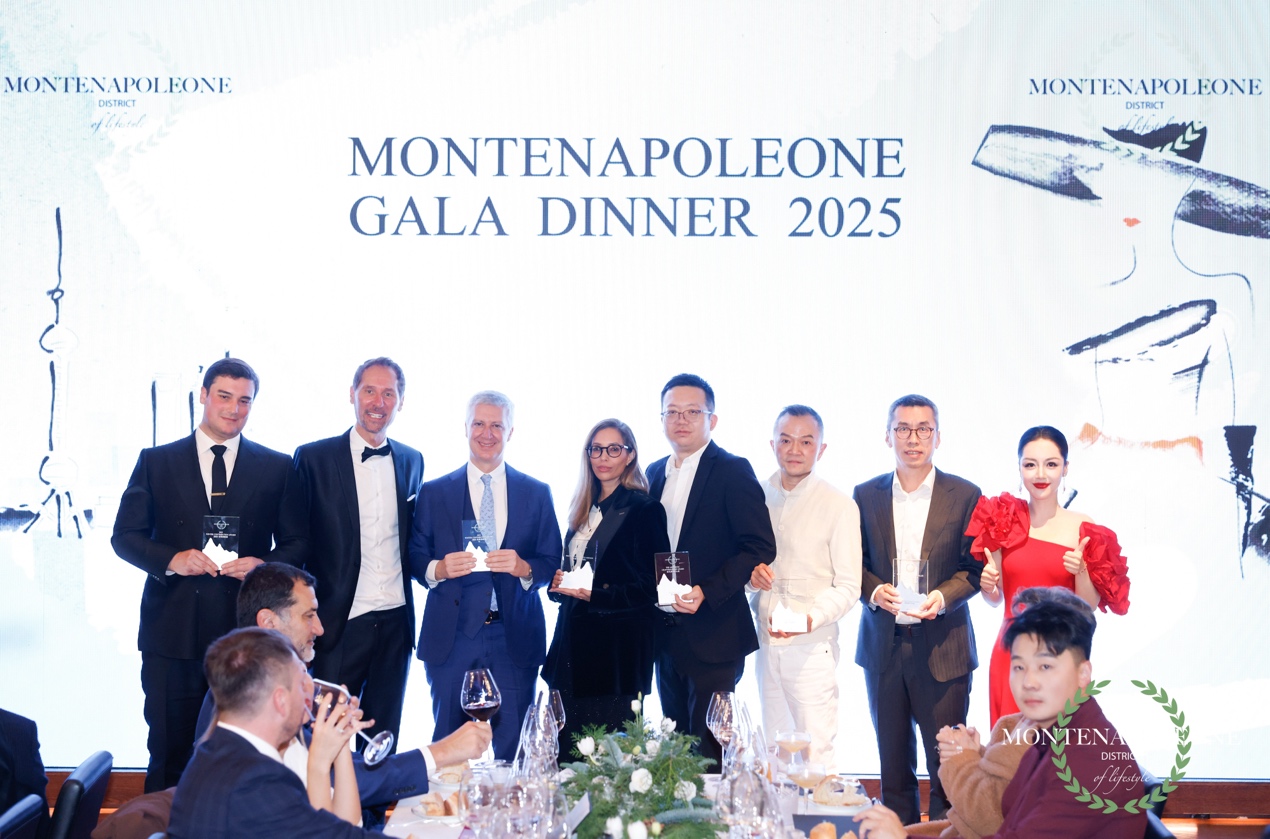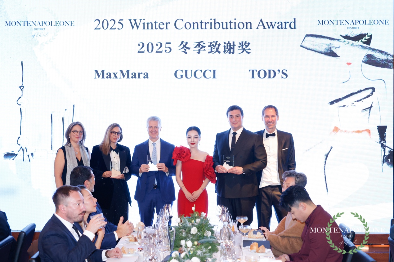 此外,当晚同步举行了蒙特拿破仑颁奖典礼,向在 2025 年度做出卓越贡献的品牌与机构致以特别致谢。其中,2025 冬季致谢奖授予 GUCCI、MaxMara 与 TOD’S,以表彰其在奢侈品行业中的持续创新与卓越表现。2025 文化贡献奖则授予 泰发祥集团、洛克·外滩源与同策房产,以肯定其在促进城市文化发展、公共空间活化与跨文化交流方面所展现的深远影响力。
