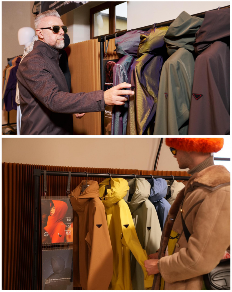 在七匹狼的展位上,买手们看到的不是随波逐流的流行色盘,而是有来处、有温度的文化故事:深邃的“黛瓦黑”,源于皖南古村落层层叠叠的屋瓦,代表着中国商旅人士如徽商般沉稳、坚毅与历久弥新的内在力量;宁静的“天水碧”,则萃取自杭州西湖的潋滟水,隐喻着穿梭于繁忙旅程中的心境,仍可保有一片开阔与澄明。而取自敦煌壁画的“岩沙绿”,带着历经风沙的生机,象征着在漫长旅途中始终葆有的活力与希望。