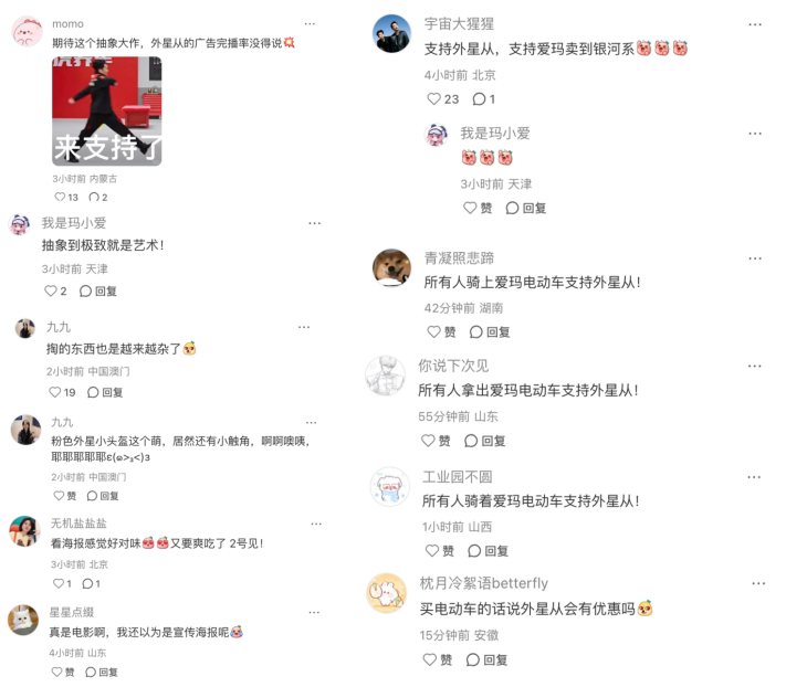 本次爱玛微电影官宣海报,画面以充满科幻趣味与潮流色彩的视觉语言,展现了爱玛在“年轻化”与“内容创意”上的深度融合能力。通过官方社媒评论区里网友们的讨论,也展示了爱玛与年轻人零距离,搭建对话窗口,网友评价“抽象到极致就是艺术”。