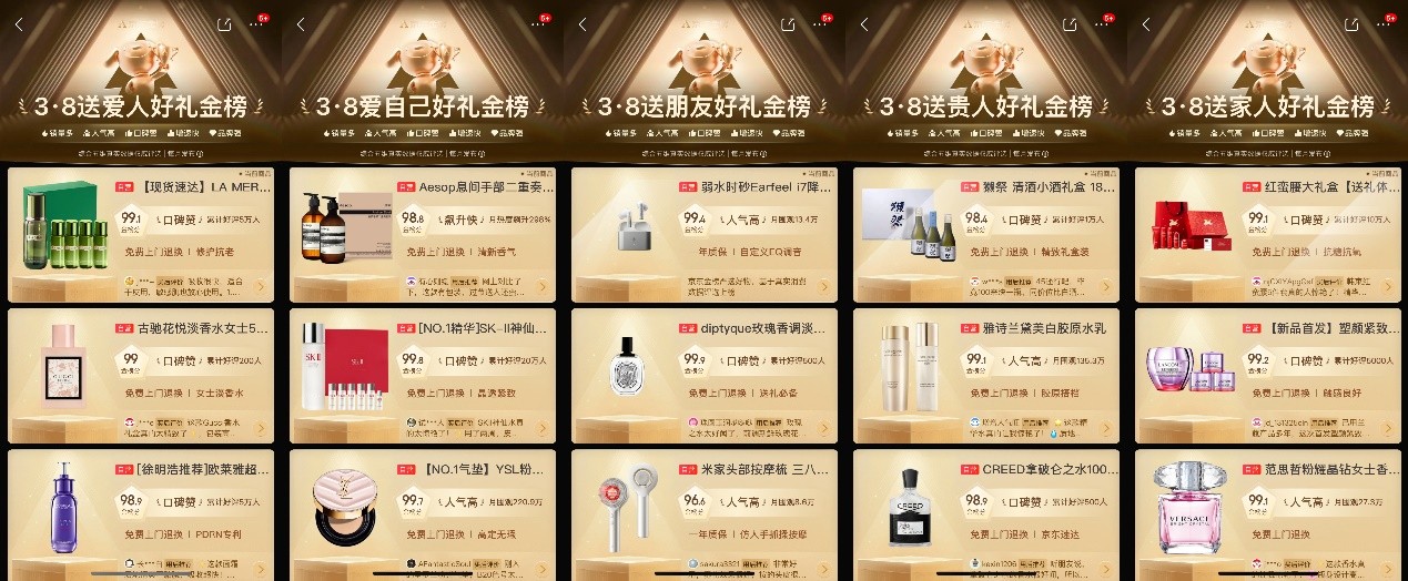 除了派送节日好礼,为了满足3.8节期间消费者多元化的送礼需求,京东还基于平台亿万消费者的真实购买数据,围绕“送自己、送爱人、送家人、送朋友、送贵人”五大核心场景,推出“3.8犒劳老己好礼金榜”、“3·8送朋友好礼金榜”、“3·8送爱人好礼金榜”、“3·8送家人好礼金榜”、“3·8送贵人好礼金榜”五大榜单,从海量商品中精选出适配各个送礼场景的好物,帮助消费者精准锁定礼物选择,让3.8节的每一份心意都能恰到好处。