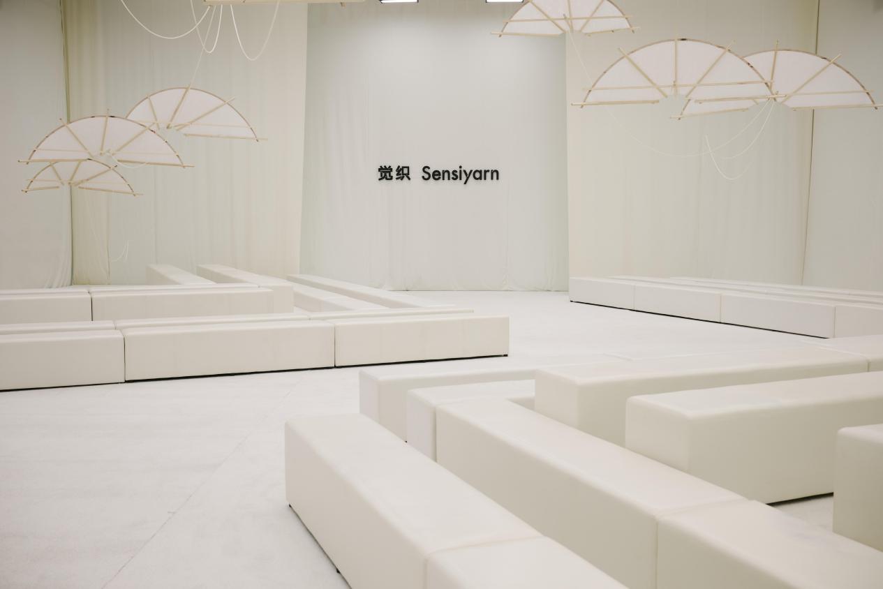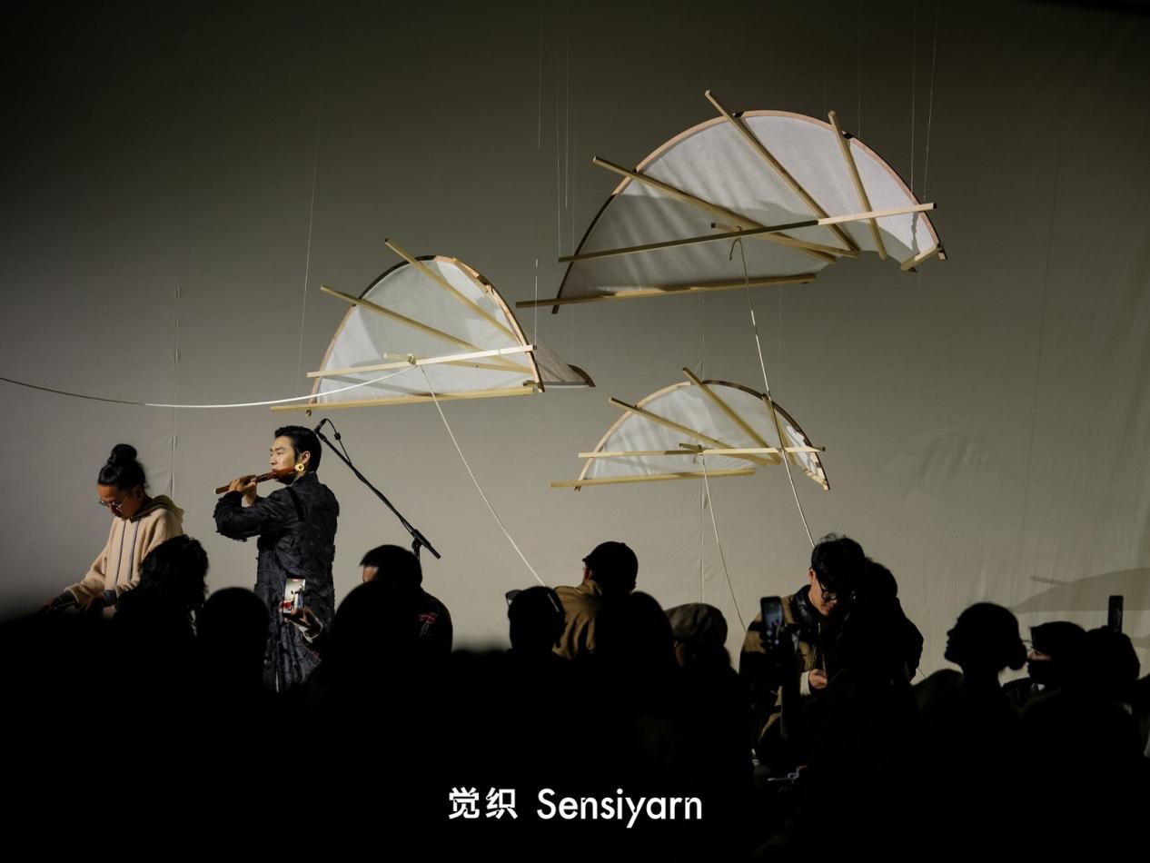 秀场空间将松型风筝作为形态演变,清透留白构筑轻松意境,将自然山林的空灵与现代极简美学结合,让观者步入即沉浸于松弛自在的场域,与服装、音乐、意境形成完整共鸣。