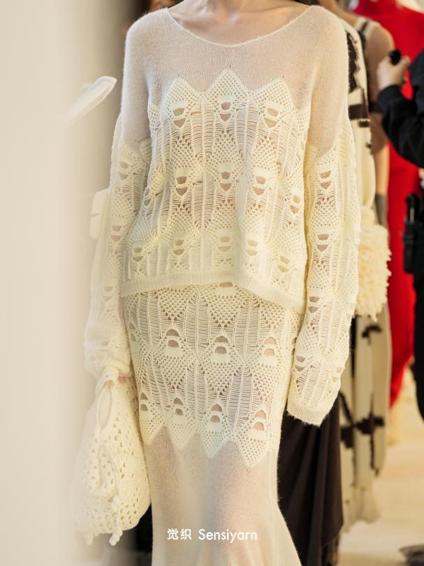 采用双层提花结构,图案以松塔渐变形态为灵感,通过硬朗与柔软、通透与实穿、疏与密、松与紧的多元对比,演绎东方针织的含蓄张力。