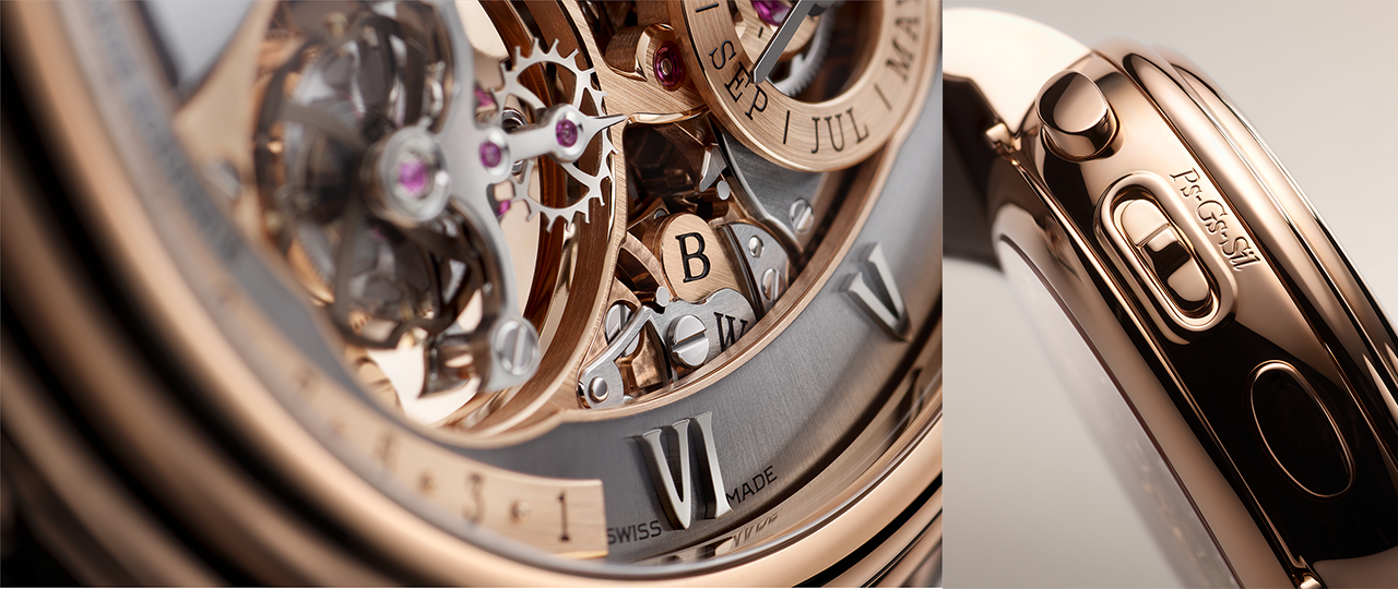 15GSQ大音乐家超复杂功能腕表摒弃传统模块叠加形式,创新采用整合式设计,令腕表厚度仅有14.5毫米,实现超薄且舒适的佩戴体验。万年历模块被匠心布局于腕表右侧,为四音四锤、陀飞轮装置预留充裕空间,令精密机芯的机械肌理与构造之美全然铺展,一览无余。